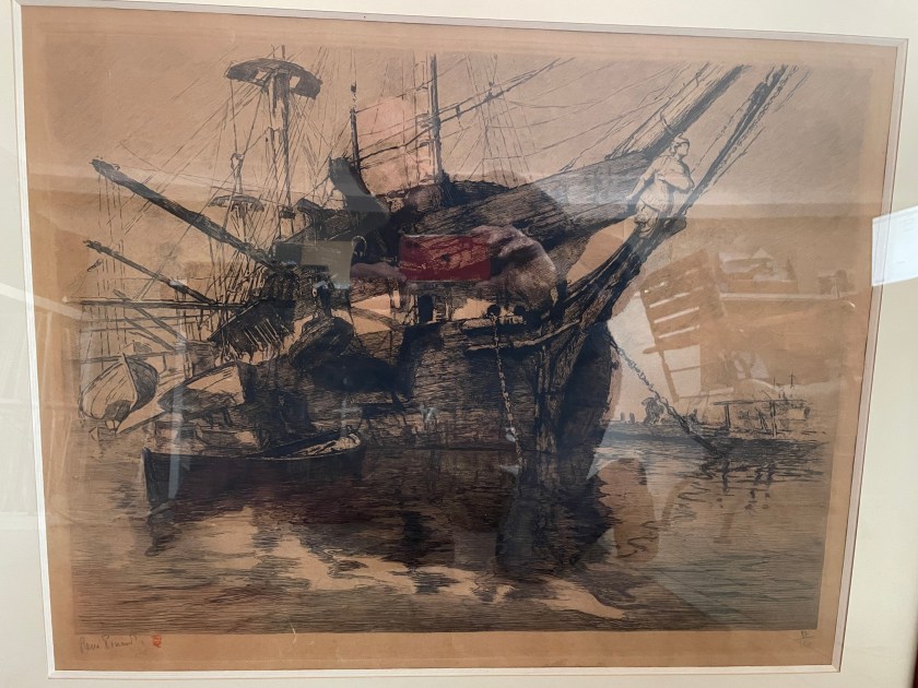 Pendant près de trente ans, mes grands-parents Eugène et Mathilde Cochard habitent à Vannes, dans un immeuble du 1, rue Billaut, dans le centre ville. Dans leur appartement, je me souviens particulièrement d’un tableau. La masse imposante du navire, sombre, voire inquiétante, frappait mon imagination d’enfant. Il s’agit d’une gravure de René Pinard, peintre de la Marine, né à Nantes en 1883 et mort à Paris en 1938.