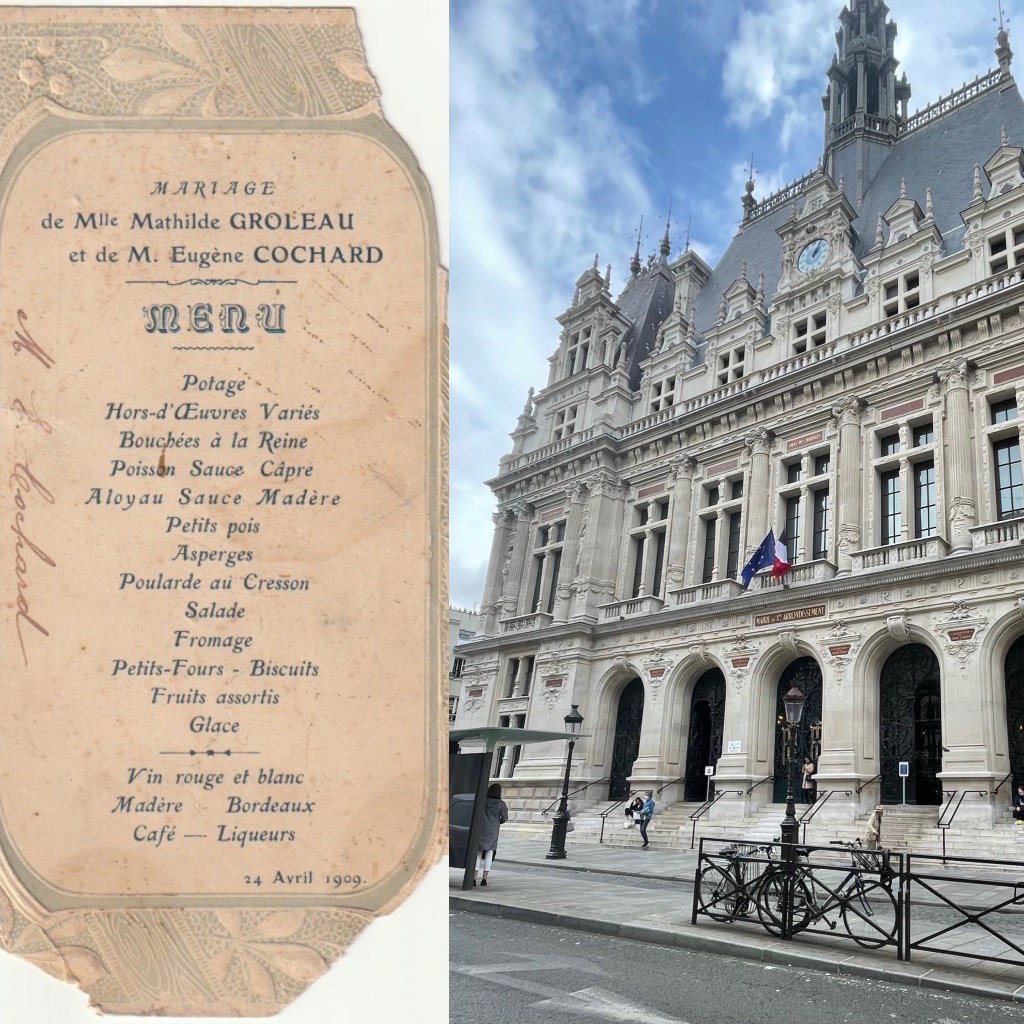 Le 24 avril 1909, Eugène Cochard, 23 ans, caporal au 65ème régiment d’infanterie de Nantes, épouse Mathilde Groleau, 21, couturière, à la Mairie du 10ème arrondissement. La mère d’Eugène, le père de Mathilde sont décédés, le père d’Eugène a été déclaré disparu en 1903. Mathilde est domiciliée chez sa mère, Marie Tessier, giletière, à Paris, 22 rue de la Fidélité. Les témoins sont tous nantais et âgés: la tante Anne Cochard, 67 ans, le grand-père Henri Tessier, cordonnier, 71 ans, l’oncle Léon Baudry, tapissier, 52 ans.