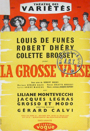Un beau jour de 1963, mes parents vont à Paris assister à une représentation de la Grosse Valse, revue théâtrale de Robert Dhéry sur une musique de Gérard Calvi et des lyrics d’André Maheux. En vedette, Louis de Funès, et la troupe des Branquignols. Cette comédie poétique et farfelue connaît un succès ininterrompu et tient l’affiche du théâtre des Variétés pendant quinze mois, jusqu’en janvier 1964. Louis de Funès joue le rôle d’un douanier à Orly, où l’aérogare moderne a été inaugurée en 1961.