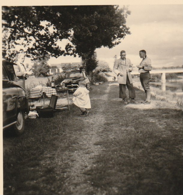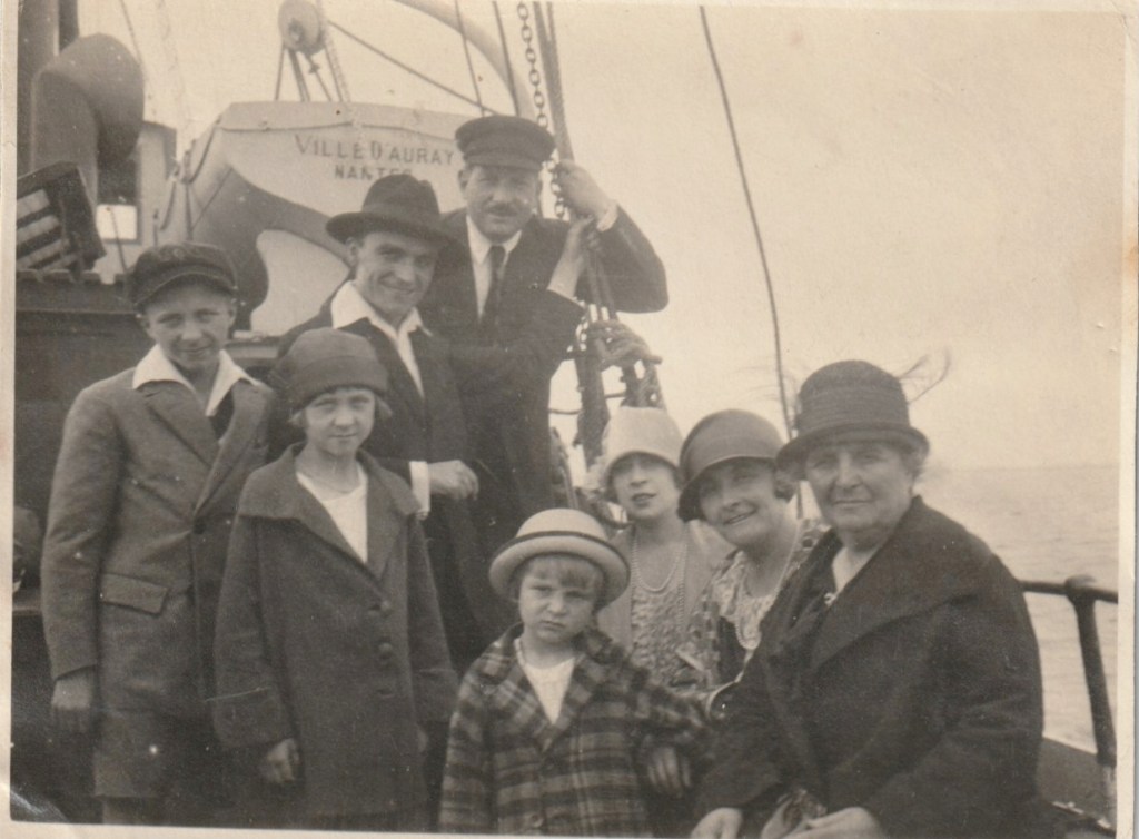 Cette photo représente la famille Cochard au milieu des années 1920. Elle a vraisemblablement été prise sur « le bac de Mindin » reliant Paimboeuf à Saint-Nazaire. Le bac était le seul moyen de traverser l’estuaire avant la construction du pont, en 1975. Mon père, né en 1922, est au premier-plan. A sa droite, sa soeur Mathilde et son frère Jean. Son père, Eugène, porte la casquette. Avec le chapeau, son beau-frère Paul Groleau. Devant à droite, la grand-mère Groleau, devant ma grand-mère Mathilde. J’ignore qui est la jeune fille à l’arrière-plan.