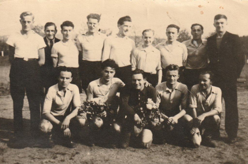 Pendant la guerre de 1939-1945, mon père Paul Cochard travaille en Allemagne chez un prothésiste dentaire, près de Dresde. Cela ne se passe apparemment pas trop mal, bonne ambiance au travail, sorties, matches de foot. Paul (le deuxième en bas en partant de la droite) est le goal de l’équipe, photographiée ici à l’été 1944 lors d’une rencontre avec des Tchèques, l’arbitre est hollandais.